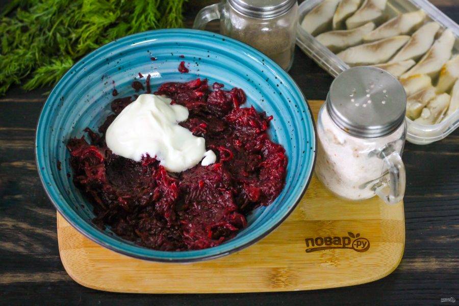 Натрите свеклу в салатник на терке с мелкими ячейками и обязательно отожмите массу, чтобы удалить жидкость. Выложите сметану или майонез любой жирности, посолите и перемешайте.