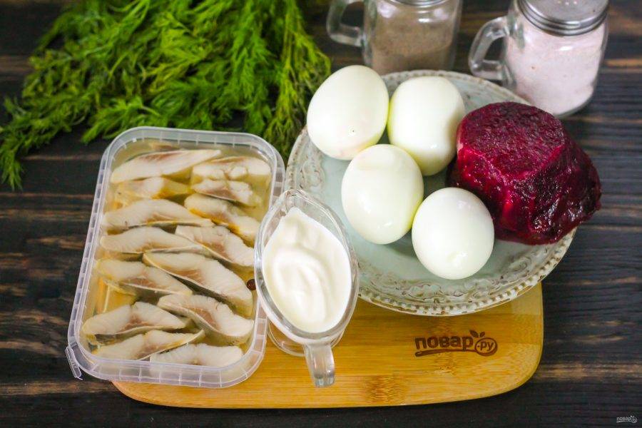 Подготовьте указанные ингредиенты. Свеклу и куриные яйца отварите заранее, остудите. Очистите от кожуры свеклу, а яйца - от скорлупы и промойте.