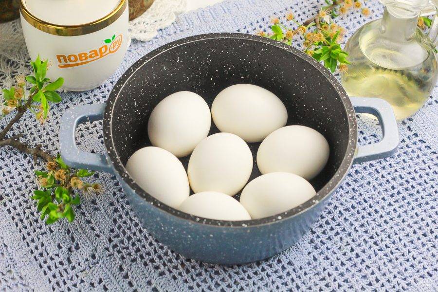 Подготовьте указанные продукты. Приобретите яйца с белой скорлупой — на них поталь смотрится более выигрышно, нежели на коричневых.