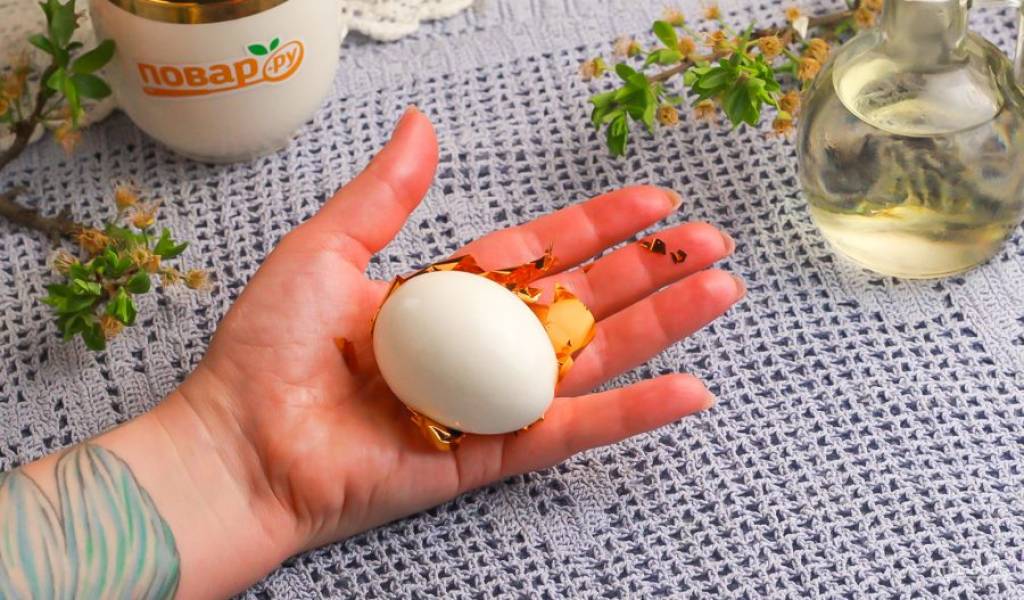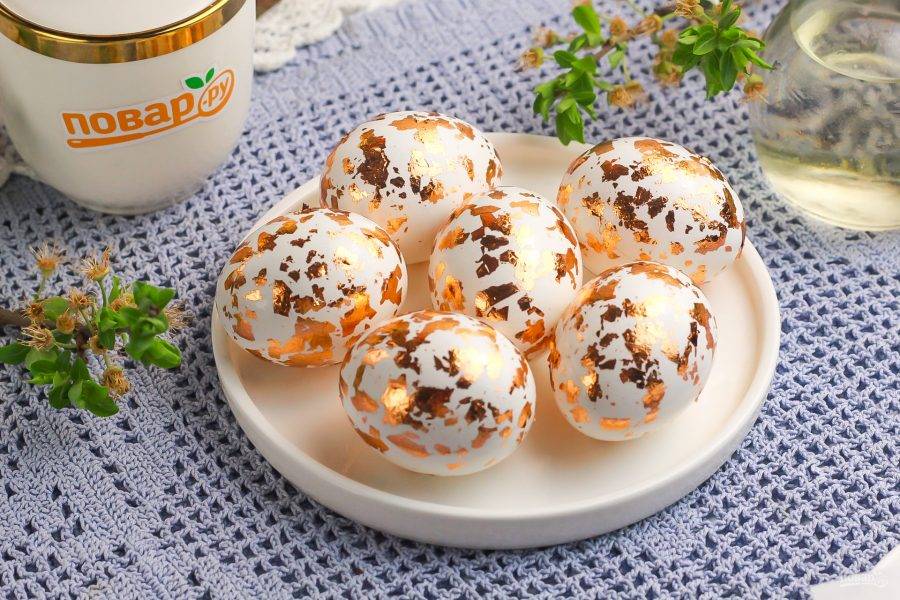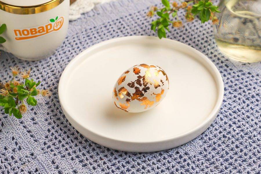 Таким же образом декорируйте и остальные отварные яйца. Оставьте их на 1-2 часа, чтобы масло просохло — поталь приклеится надежнее к скорлупе.