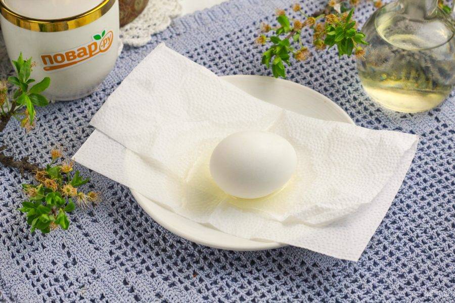 Выложите на блюдце или тарелку бумажную салфетку и влейте на нее растительное масло без аромата. Выложите отварное куриное яйцо и смажьте его маслом со всех сторон.