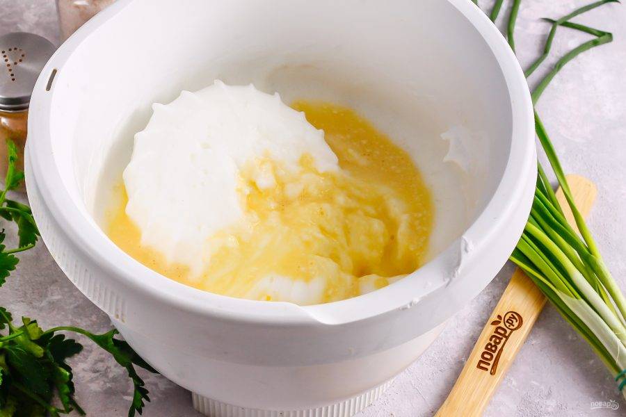 Перелейте желтки ко взбитым белкам и аккуратно все перемешайте.