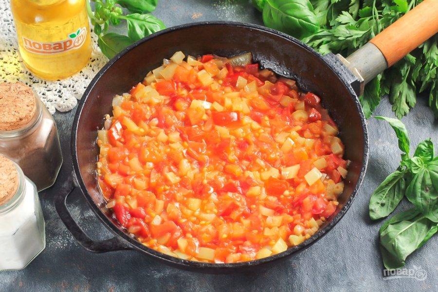 Тушите все содержимое примерно 5-8 минут, пока помидоры не отдадут весь свой сок.