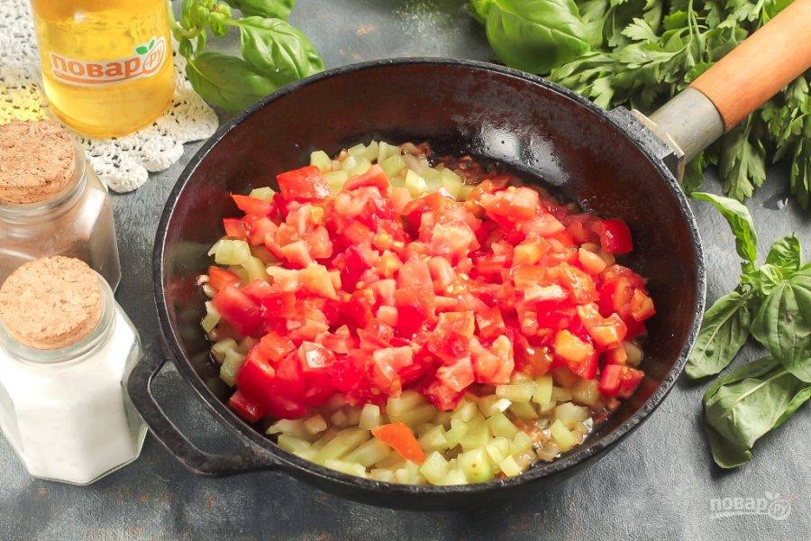 Промойте помидоры и болгарский перец. Перец очистите от семян и нарежьте овощи мелкими кубиками. Добавьте в сковороду. Посолите и поперчите, перемешайте.