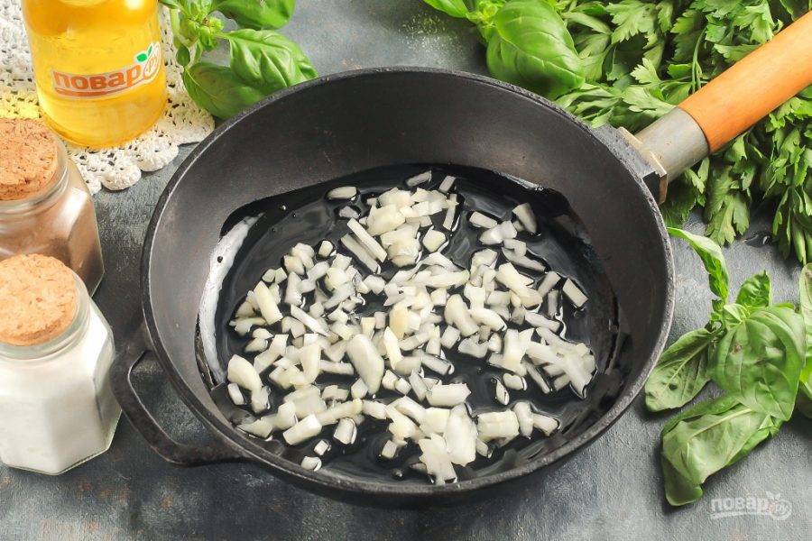 Лук и чеснок очистите от кожуры, промойте. Нарежьте луковицу мелкими кубиками, а чеснок — мелко порубите. Обжарьте на сковороде в растительном масле примерно 3 минуты до легкой румяности на умеренном нагреве.
