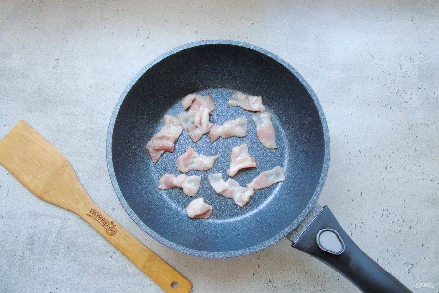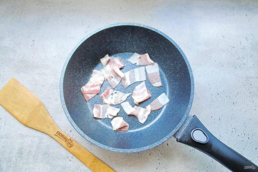 Бекон нарежьте небольшими кусочками и выложите в горячую сковороду.