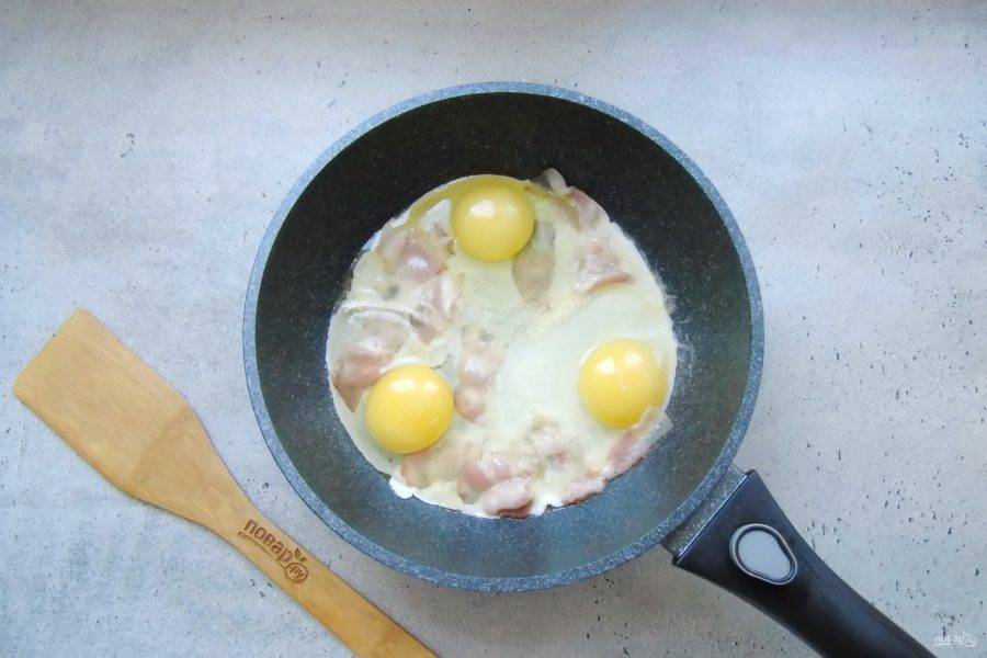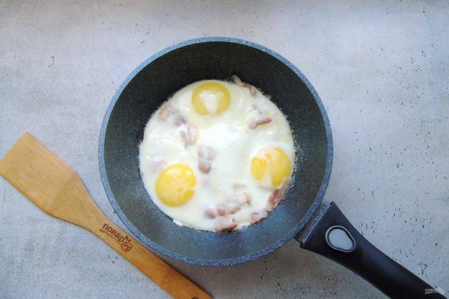 Жарьте яйца с беконом на небольшом огне до готовности 3-4 минуты.