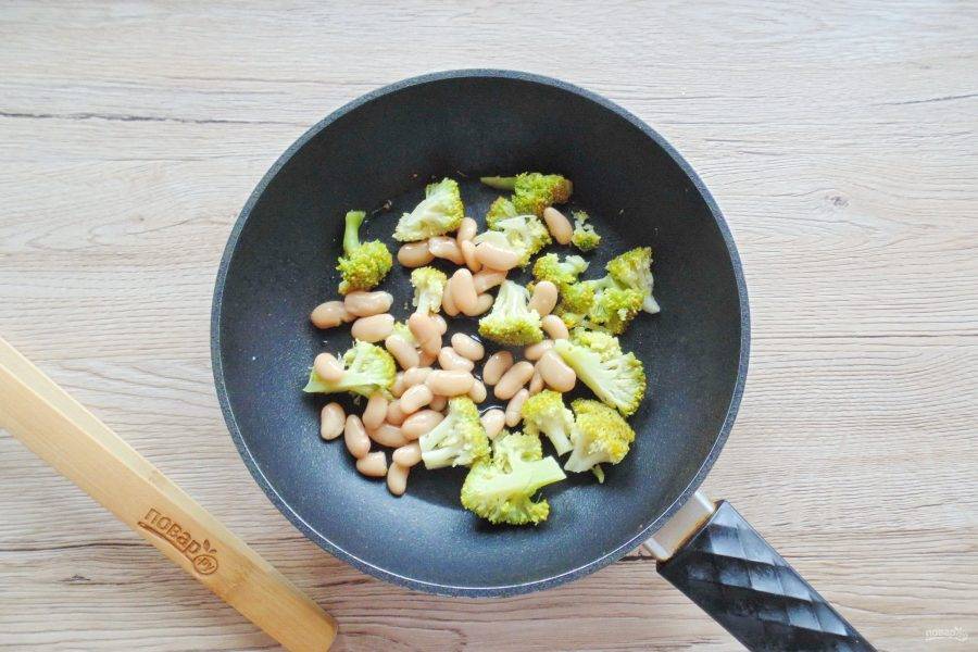 Брокколи разберите на небольшие соцветия и отварите в воде 5-7 минут. Откиньте на сито. Переложите в сковороду.