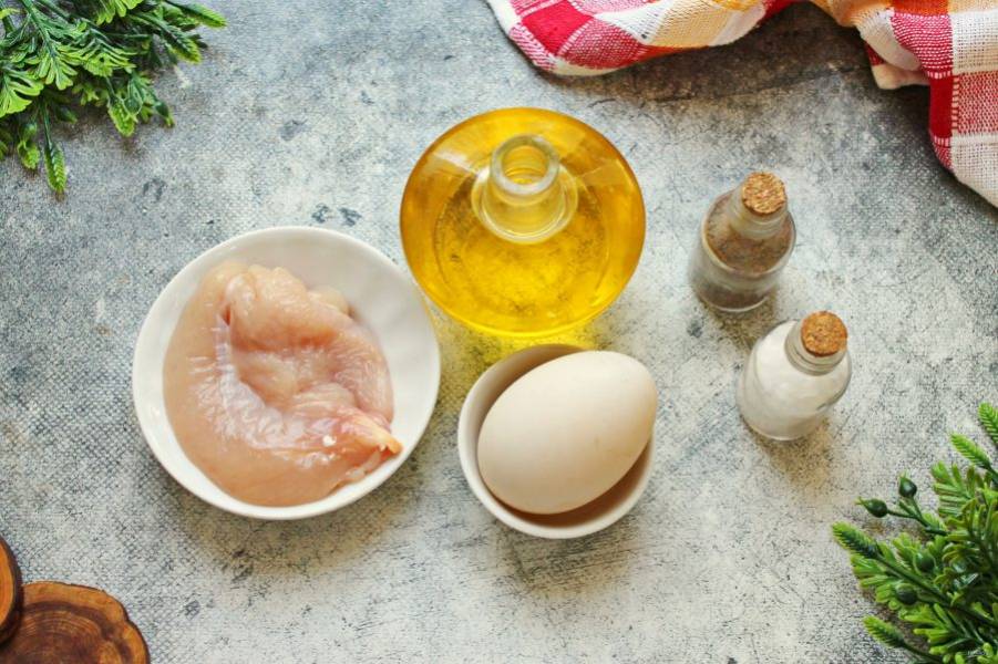 Подготовьте все необходимые ингредиенты для приготовления яичницы с курицей.