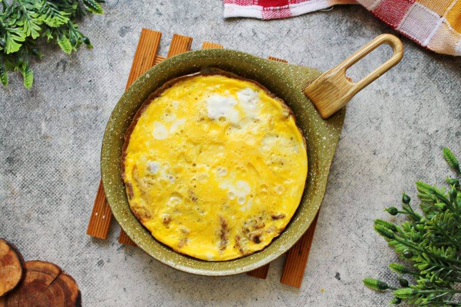 Закройте сковороду крышкой и готовьте на медленном огне в течение 3-4 минут. Яичница должна полностью прожариться и стать плотной.