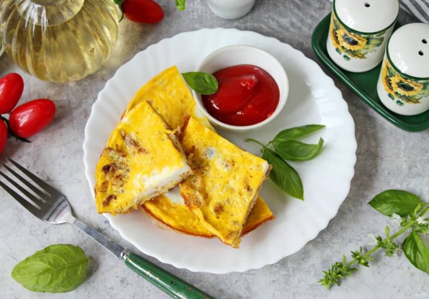 Яичница с курицей готова. Разрежьте ее на порции и сразу подавайте к столу.