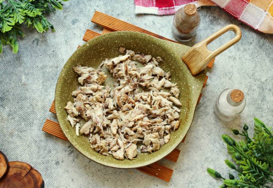 Куриное филе вымойте и отварите в соленой воде до готовности, примерно 25 минут. Готовую курицу достаньте, остудите и порежьте на кусочки.