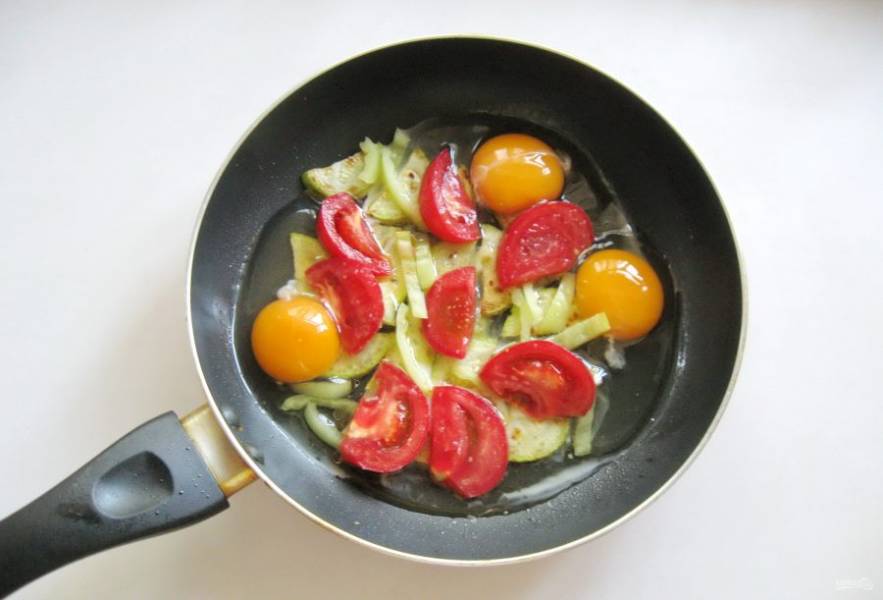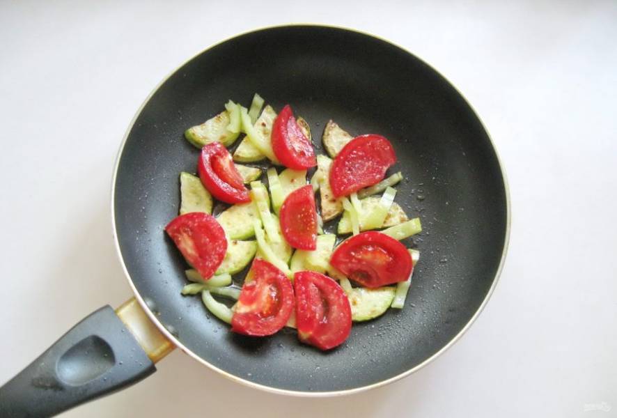 Помидор помойте и нарежьте дольками. Выложите в сковороду.