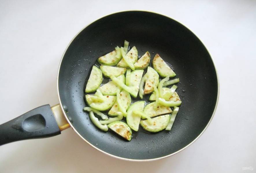 Обжарьте кабачки в течение 5-6 минут с обеих сторон до легкой золотистой корочки. Болгарский перец нарежьте соломкой и добавьте к кабачкам.