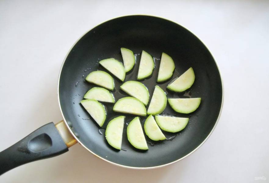 Кабачок помойте и нарежьте произвольно. У меня половинки кружков. Выложите в горячую сковороду с рафинированным подсолнечным маслом.
