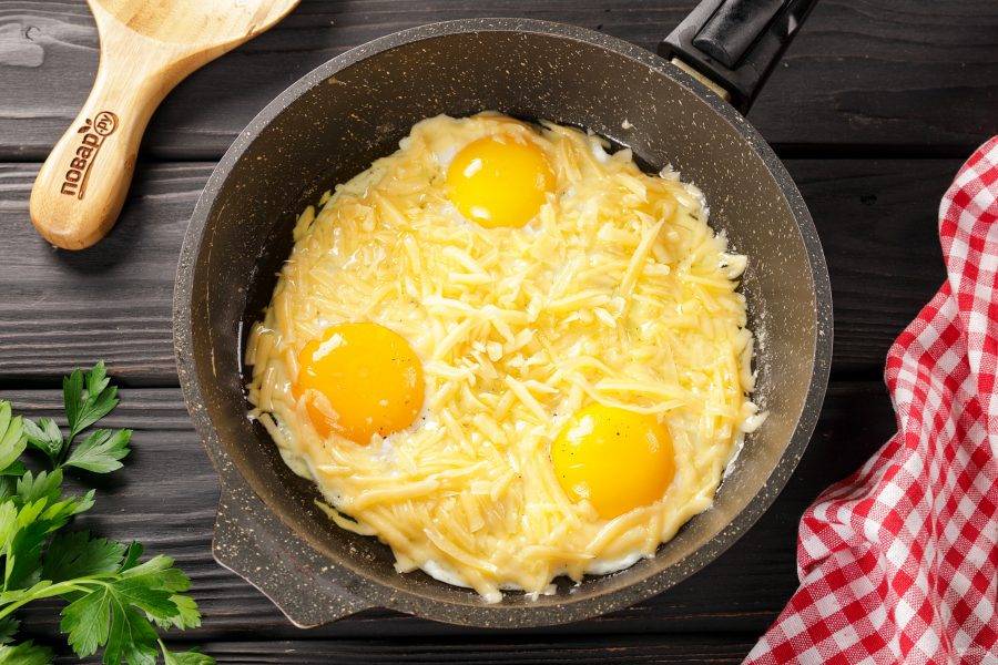 Посыпьте яичницу сыром. Каким будет желток в готовой яичнице, выбирать вам. Накройте сковороду крышкой и готовьте 2-3 минуты. Если любите жидкий желток, то тогда лучше не накрывать.