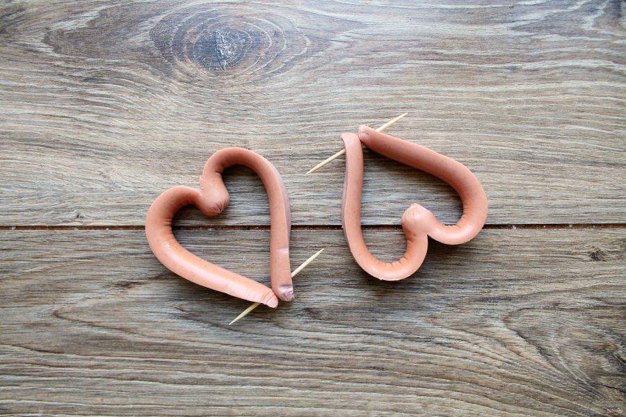 Сосиски очистите от пленки, если такая имеется, и разрежьте их вдоль посередине, не доходя до другого конца примерно 2 сантиметра. Разведите концы в разные стороны и соедините, придавая сосиске форму сердца. Соедините концы зубочисткой.