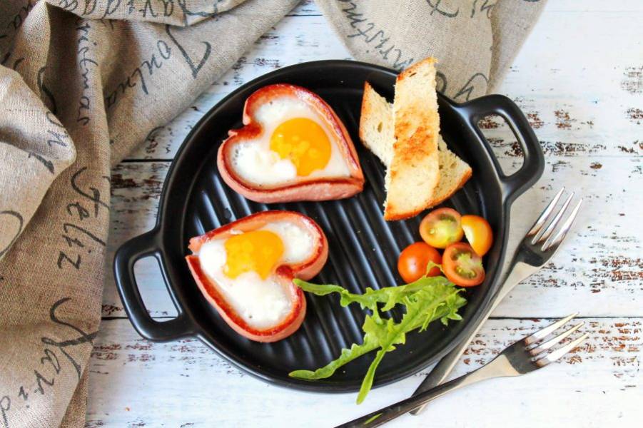Аккуратно вылейте по одному яйцу в середину, посолите белок и жарьте яичницу на медленном огне, без крышки, до желаемой степени. Снимите яичницу сердечком со сковороды и сразу подавайте к столу.