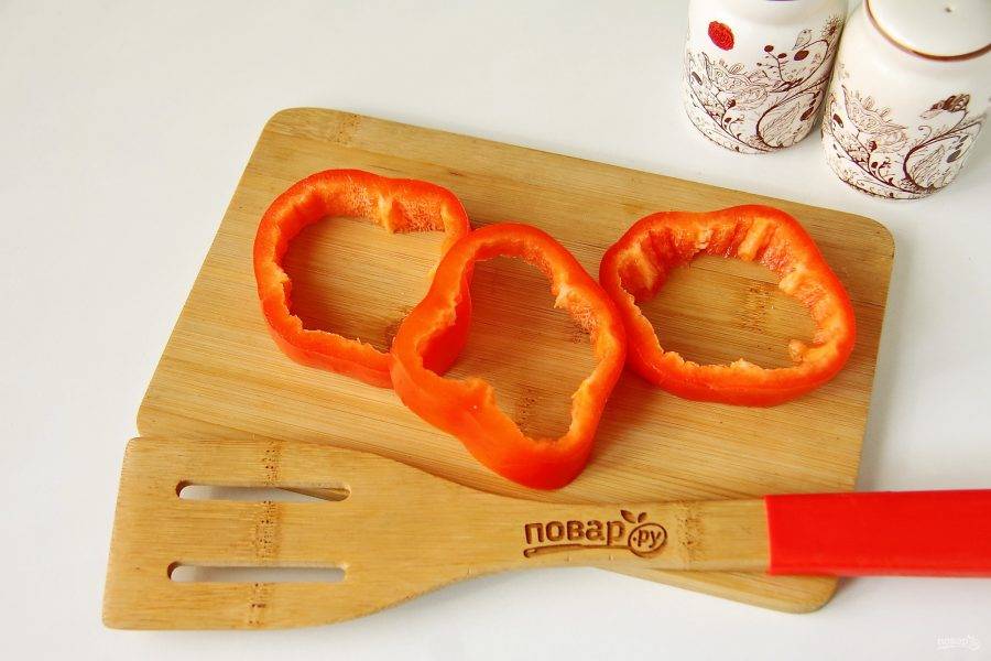Перец вымойте и отрежьте от него примерно ближе к середине три кольца, примерно 1 см. высотой.