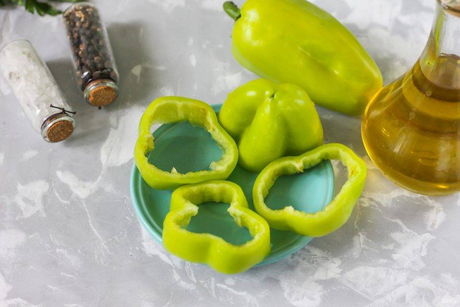 Промойте овощи и срежьте крышечку, удалите семена и еще раз промойте внутри. Нарежьте кружочками шириной не менее 1 см. Желательно приобретать крупные перцы, чтобы овощные кольца получились широкими. На 1 яйцо - 1 кольцо.