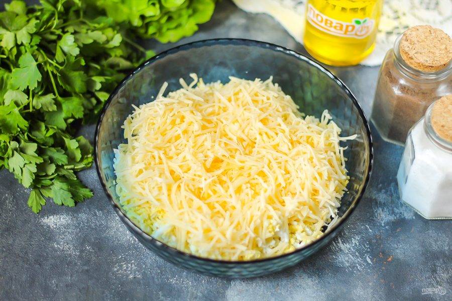 Твердый сыр любого сорта натрите на этой же терке в емкость к куриным яйцам. Можно использовать плавленый сыр вместо твердого или рассольный: моцареллу, брынзу и т.д., но тогда соль лучше исключить из списка ингредиентов.