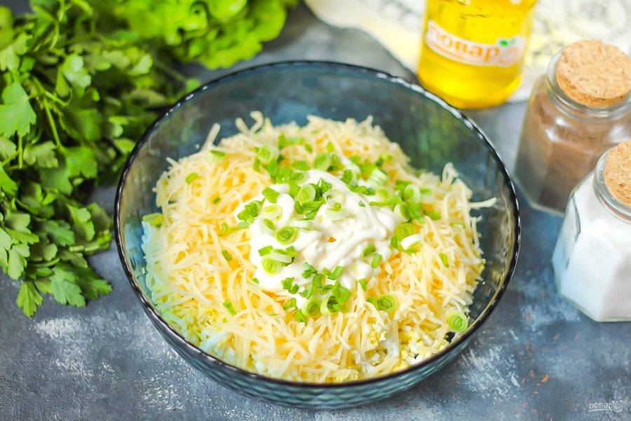 Добавьте майонез любой жирности. Промойте и измельчите зеленый лук, добавьте его нарезку вместе с солью и молотым черным перцем.