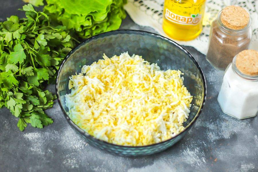 Отварные куриные яйца очистите от скорлупы и промойте в воде. Натрите на терке с мелкими ячейками в глубокую емкость.