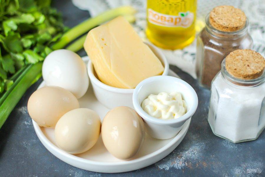 Подготовьте указанные ингредиенты. Куриные яйца заранее отварите примерно 10-12 минут и резко остудите в ледяной воде.