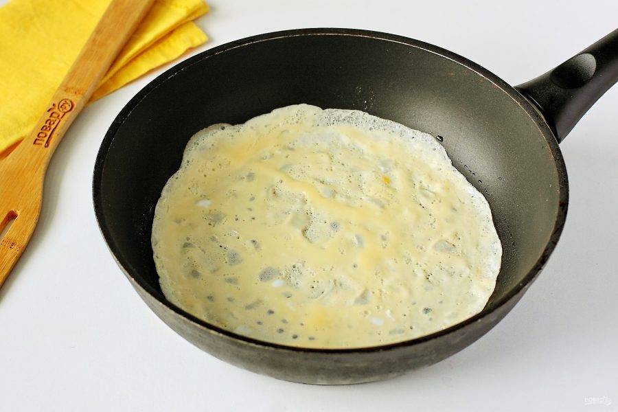 Разогрейте сковороду и смажьте ее маслом. Вылейте тонкий слой яичной смеси и на среднем огне сначала обжарьте одну сторону.