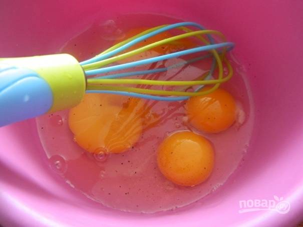 2. Взбиваем яйца со щепоткой соли и перца венчиком или миксером.