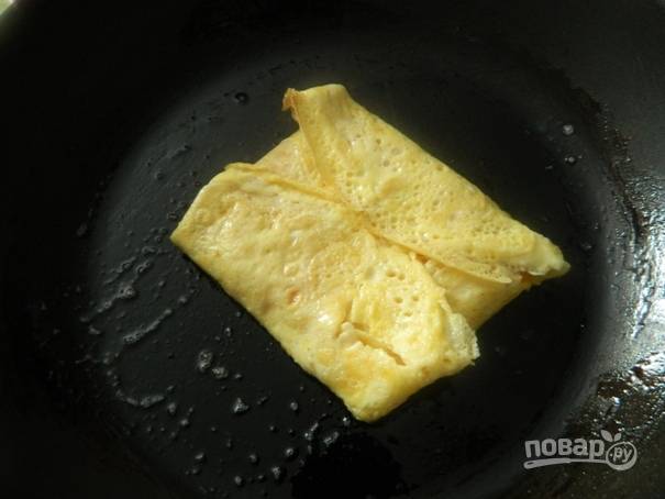 6. Затем сразу складываем блинчик конвертиком. Сверху слегка прижимаем лопаткой, чтобы сыр расплавился и склеил конвертик.