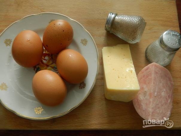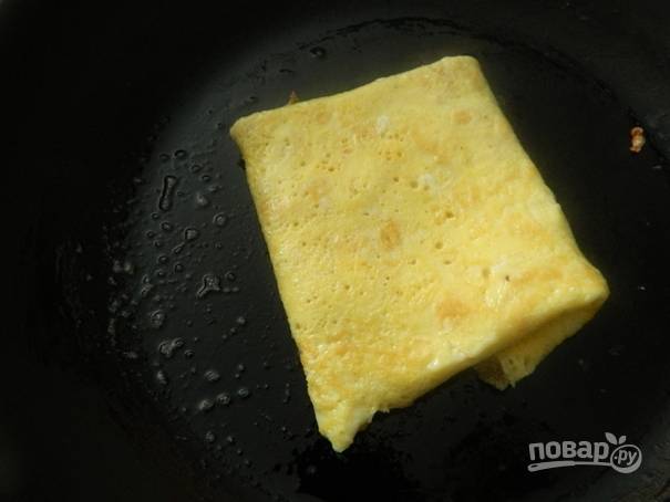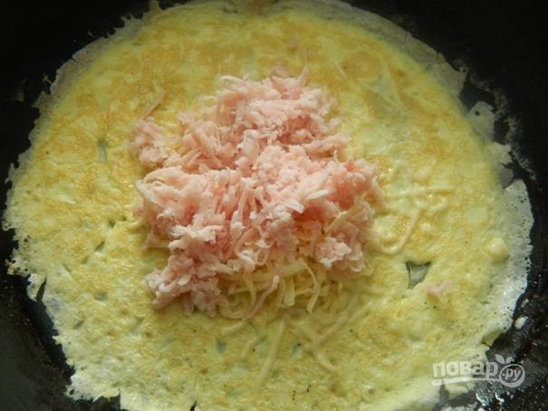 5. Жарим одну-две минуты и аккуратно переворачиваем яичный блинчик на другую сторону. В середину выкладываем сыр и ветчину