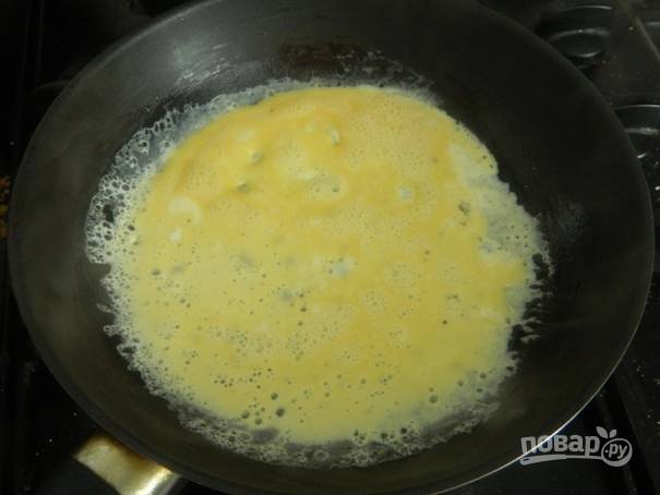 4. Затем половником или ложкой выкладываем яичную смесь на разогретую сковороду, смазанную растительным маслом.