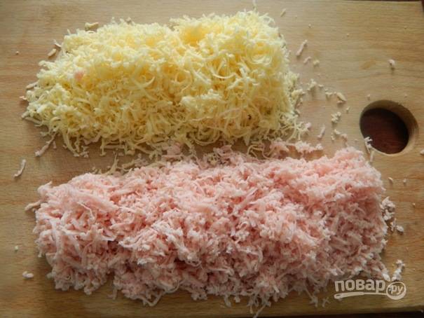 3. Сыр и ветчину трем на мелкой терке. Также можно добавить любое мясо, грибы, овощи.