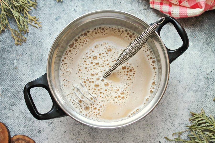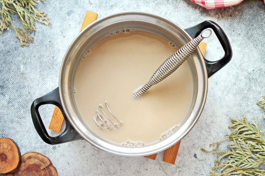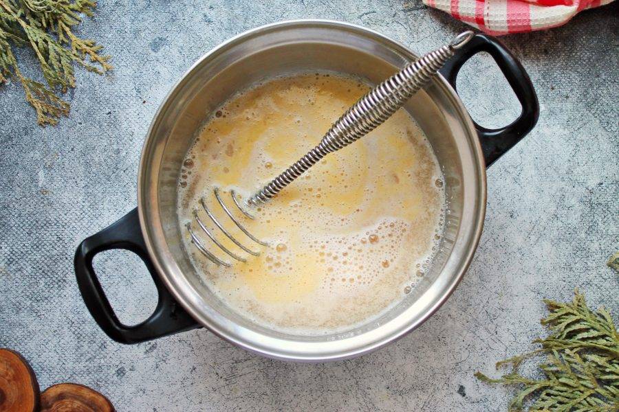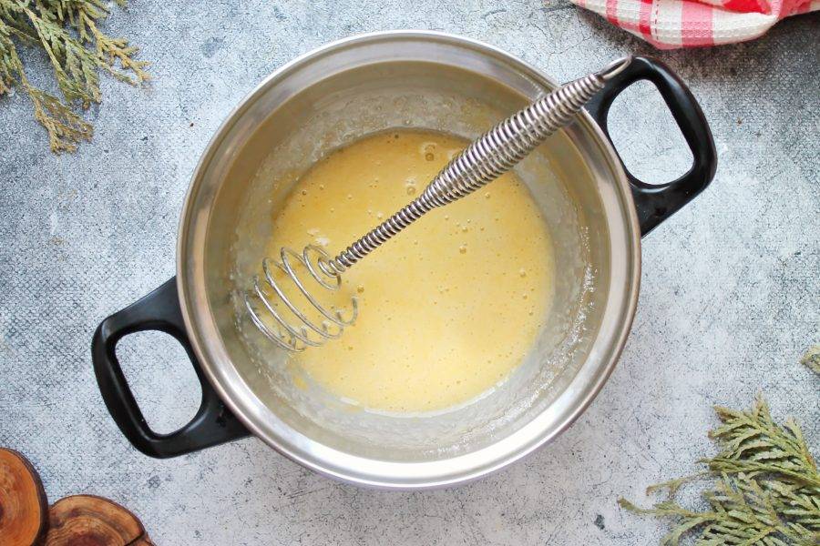 Влейте в кастрюлю полусладкое белое вино, перемешайте венчиком.