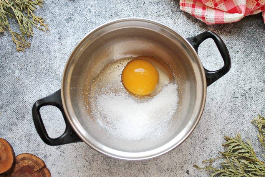 Разделите яйцо на белок и желток, белок в этом рецепте нам не понадобится. В кастрюлю или сотейник с толстым дном выложите сахарный песок, ванильный сахар и желток.