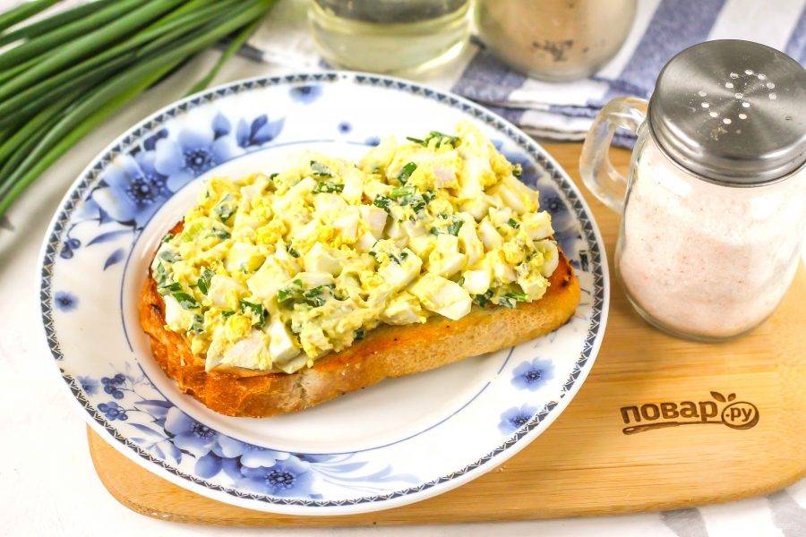 Выложите яичный салат на ломтик поджаренного хлеба плотным слоем.