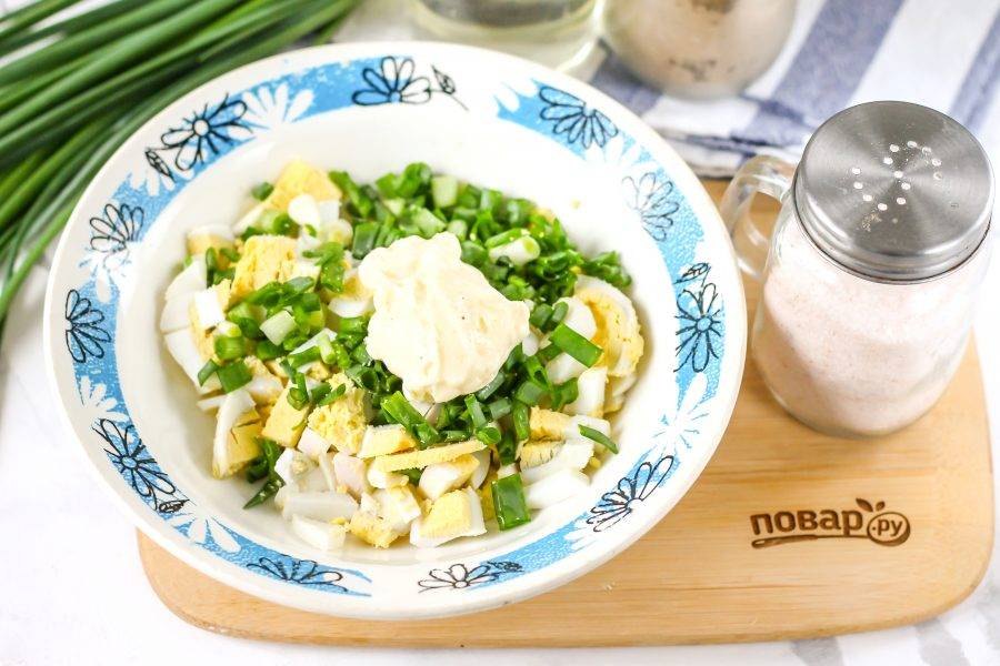 Яйца очистите от кожуры, промойте в воде и нарежьте мелким кубиком, высыпьте в глубокую емкость. Промойте стебли зеленого лука и так же их измельчите. Добавьте в емкость.
