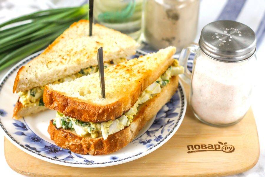 Самый быстрый перекус, который можно приготовить имея в наличии отварные куриные яйца — яичный сэндвич. Готовить блюдо можно из любого сорта хлеба с прямоугольной нарезкой, например — из кирпичика.