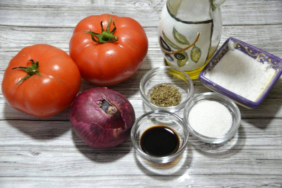 Выложите в салатник лук, помидоры, посыпьте базиликом, посолите, добавьте пару щепоток сахарного песка.