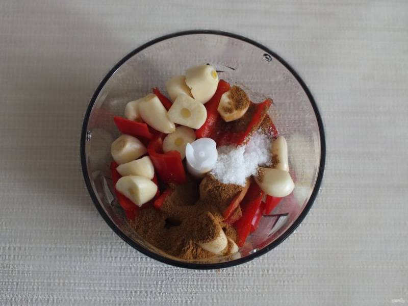 Перец очистите от семян и перегородок. Очистите чеснок.