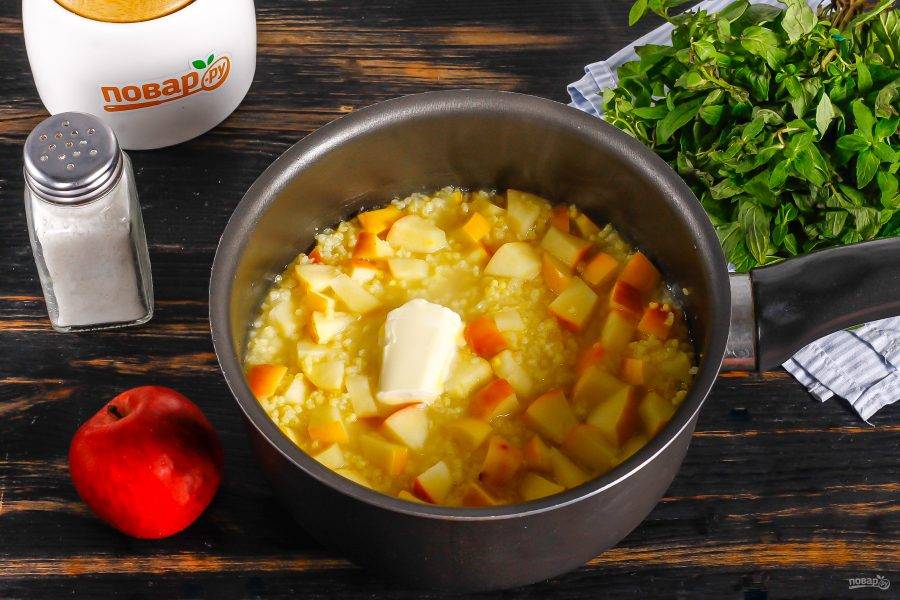 Когда каша будет почти готова, вмешайте в нее кусочек качественного сливочного масла и выключите нагрев. Оставьте кашу под крышкой в емкости на 2-5 минут для набухания.