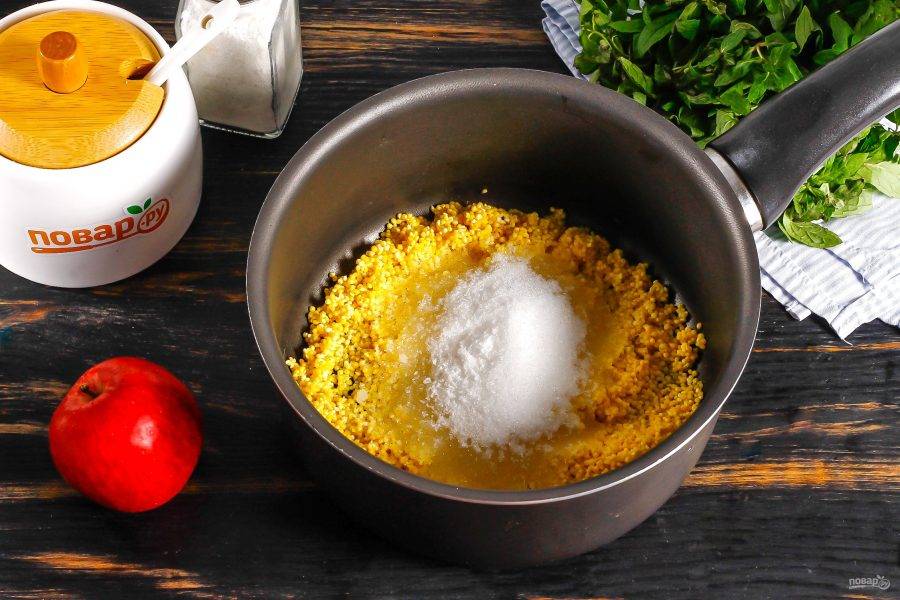 Промытую крупу пересыпьте в казан или ковш, кастрюлю с антипригарным дном. Добавьте соль и сахар. Влейте теплую воду и отварите примерно 10 минут, снимая образующуюся пену, ее будет много.