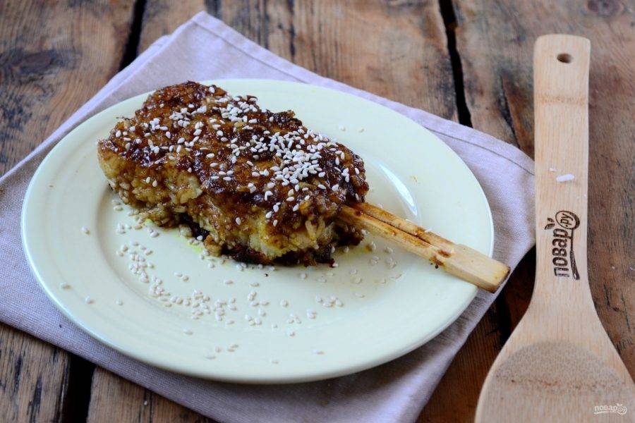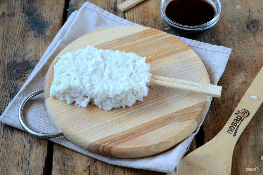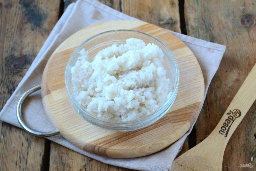 Рис отварите до готовности, можно даже, чтобы он слегка разварился и стал более мягким и вязким. Растолките рис толкушкой, благодаря чему он станет еще более вязким, а готовое блюдо не будет распадаться.