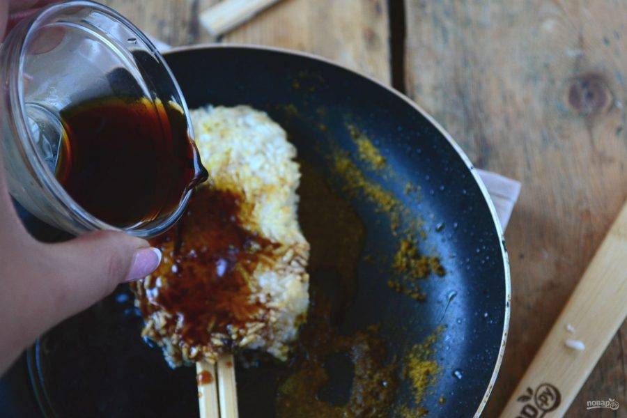 Затем переверните, добавьте все ингредиенты для соуса: соевый соус, мирин, мисо, измельченный до состояния крошки грецкий орех и немного сахара.