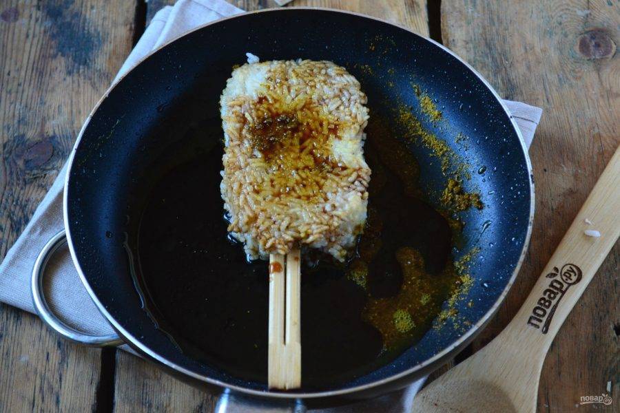 Из половины риса сформируйте лепешку, на ее середину положите деревянные палочки, и заверните, чтобы по форме лепешка напоминала мороженое.
