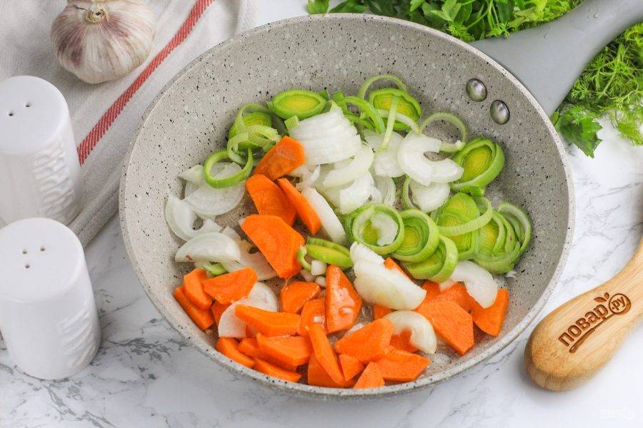 Нарежьте кольцами лук-порей и морковь, лук репчатый — полукольцами. Обжарьте примерно 3-4 минуты в растительном масле на сковороде.
