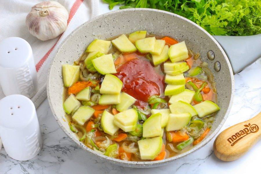 Добавьте нарезку половины кабачка и томатный соус. Его, по желанию, можно заменить помидорами, томатным соком. Влейте 100 мл. горячей воды и потушите все 5 минут.