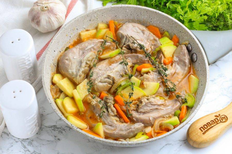 Разрежьте вертикально язычки на две части и выложите в овощной соус. Посолите, добавьте веточки тимьяна и накройте крышкой емкость. Потушите все еще 5-8 минут.