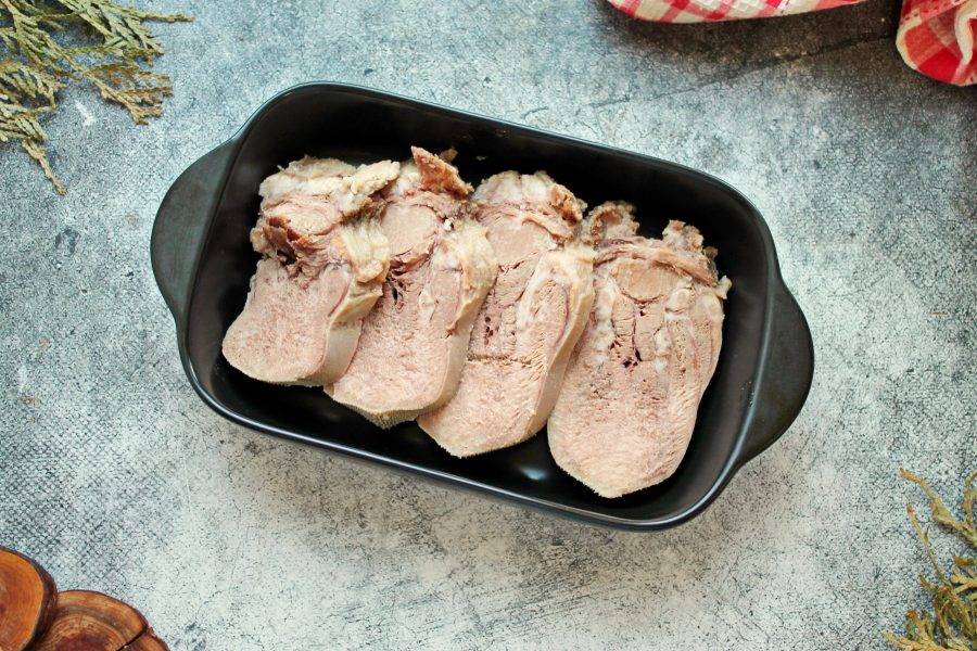 Порежьте язык поперек на толстые кусочки. Выложите говяжий язык в высокую форму для запекания.